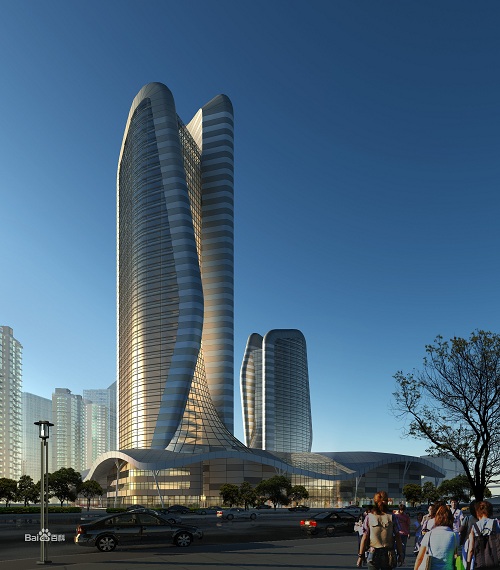 项目的建筑设计灵感源自于长江流域秀美的山水风光。塔楼形象宛若屹立于清澈、灵动的河流两旁的雄伟、秀丽的山峰,又如江边的两块圆润、光滑的卵石,隐喻“水落石出”的景象。裙房曲线形屋面宛若航空航天飞行器,具有流线型、轻盈、快速、高技术和有力的现代特征。整体造型简洁、流畅,成为体现武汉独特城市风韵的标志性建筑。项目位于武汉市汉口常青路与青年路交叉口,王家墩CBD东北角入口位置。洲际酒店建筑面积为39,472平方米,高32层,包括300多间客房和餐厅及大宴会厅、会议室、行政会所、游泳健身等功能设施。